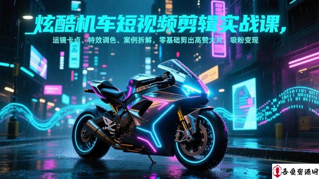 本课程《炫酷机车短视频剪辑实操教学》是针对机车文化爱好者设计的专业化剪辑实战指南。课程以机车短视频为核心场景,通过完整案例“炫酷机车”的渐进式拆解,系统教授从素材筛选与组接到动感卡点、运镜衔接、氛围特效添加、专业调色等全流程实战技巧。课程采用“理论讲解+分步实操”的方式,手把手教学员如何将普通的机车素材剪辑成具有视觉冲击力、节奏感和高级感的短视频大片,零基础学员也能跟随练习快速掌握,旨在帮助每一位机车爱好者将热爱转化为吸引眼球的优质内容。